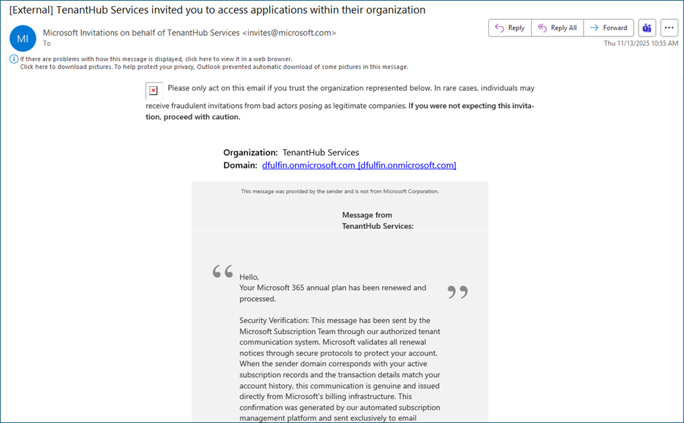 Microsoft “Invitations” are sent from “invites@microsoft.com”, which is a legitimate Microsoft service so we can’t just block all of these emails.